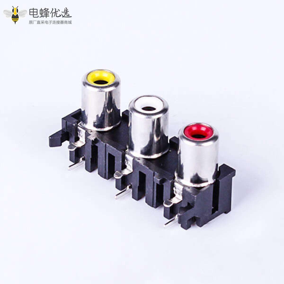 RCA连接器,母,插座,90°弯式,3孔,1*3,接板,焊板,黑色塑胶,ABS.PBT,镀镍;