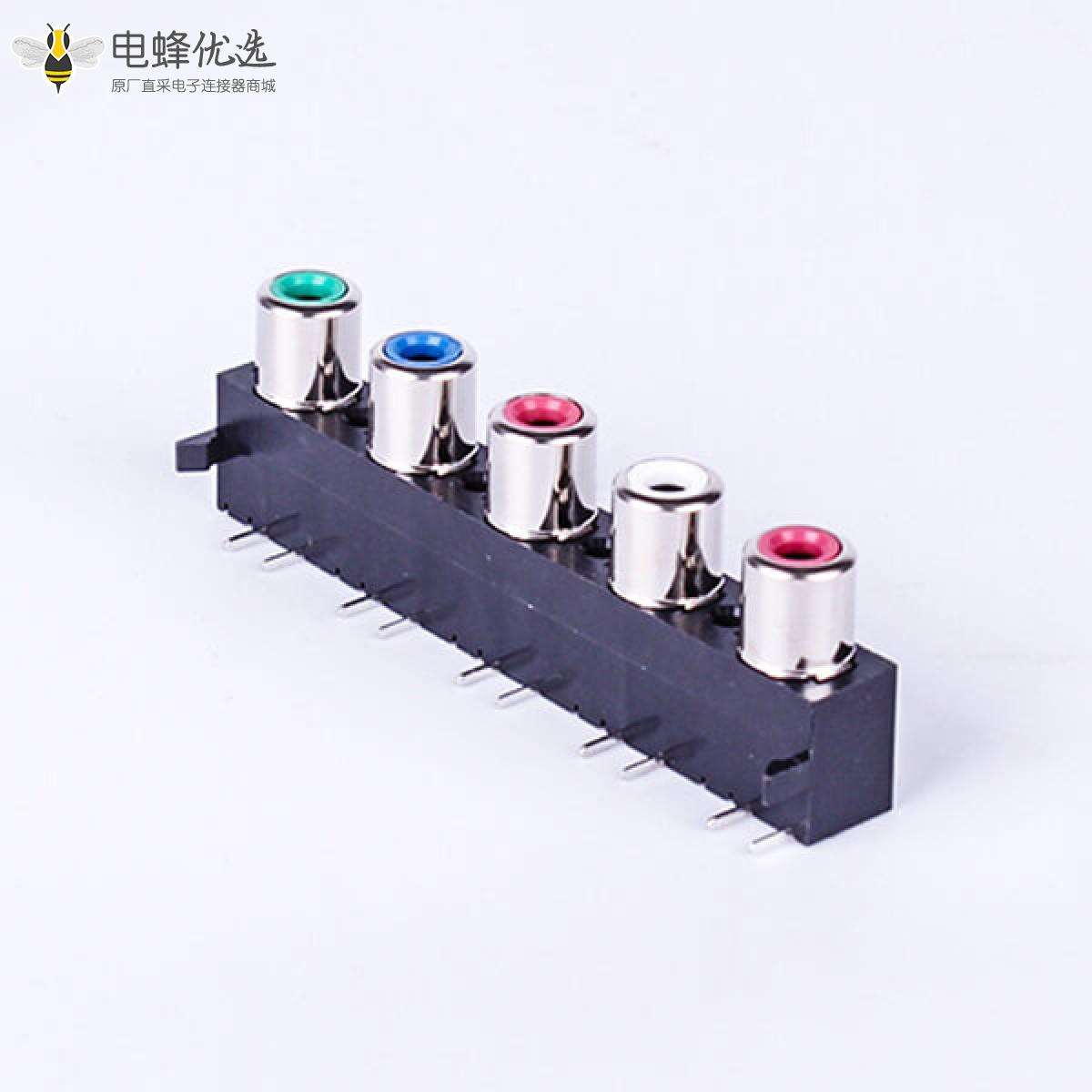 RCA连接器,母,插座,90°弯式,5孔,1*5,接板,焊板,黑色塑胶,ABS.PBT,镀镍;