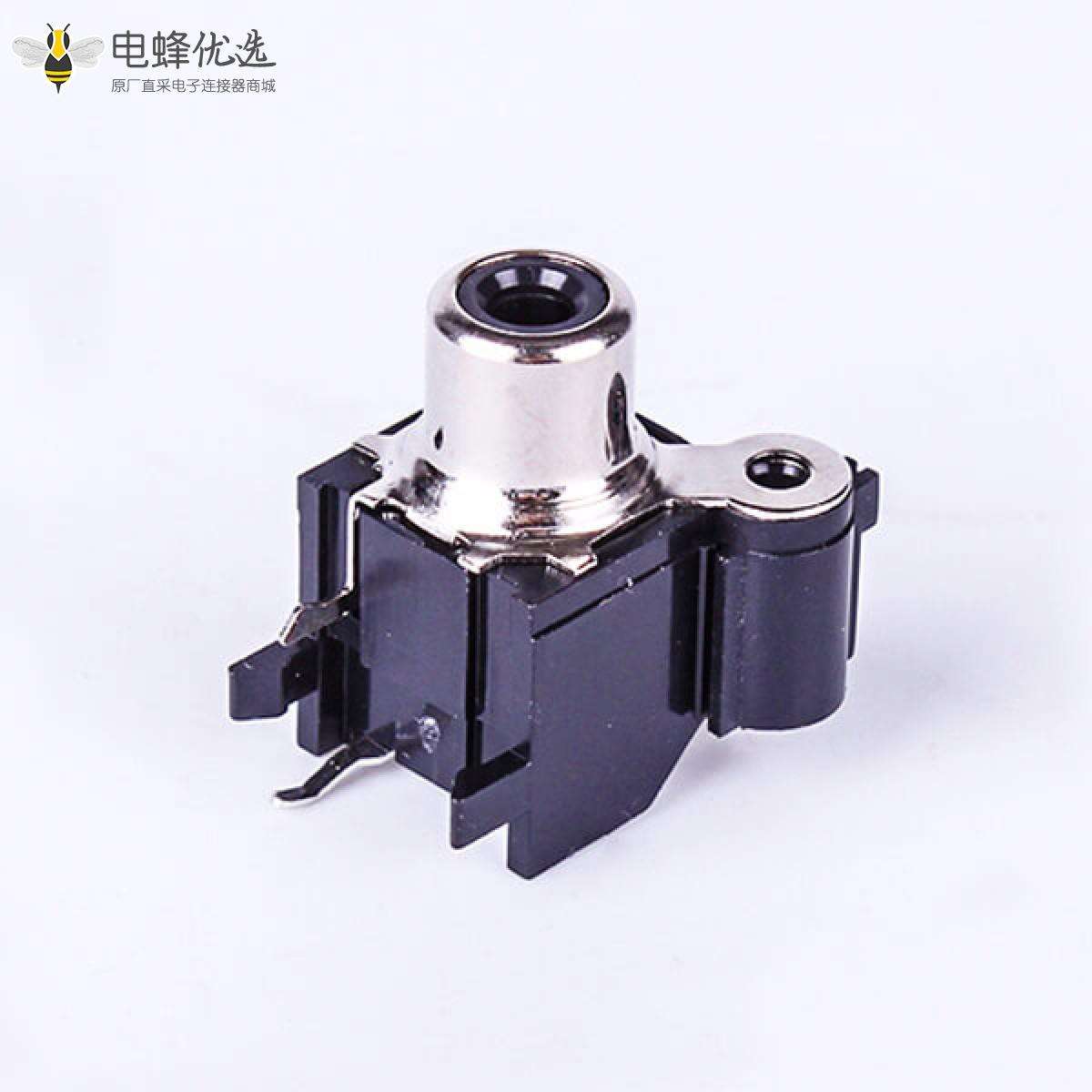 RCA连接器,母,插座,90°弯式,单口,接板,焊板,带金属屏蔽,黑色塑胶,ABS.PBT,镀镍;