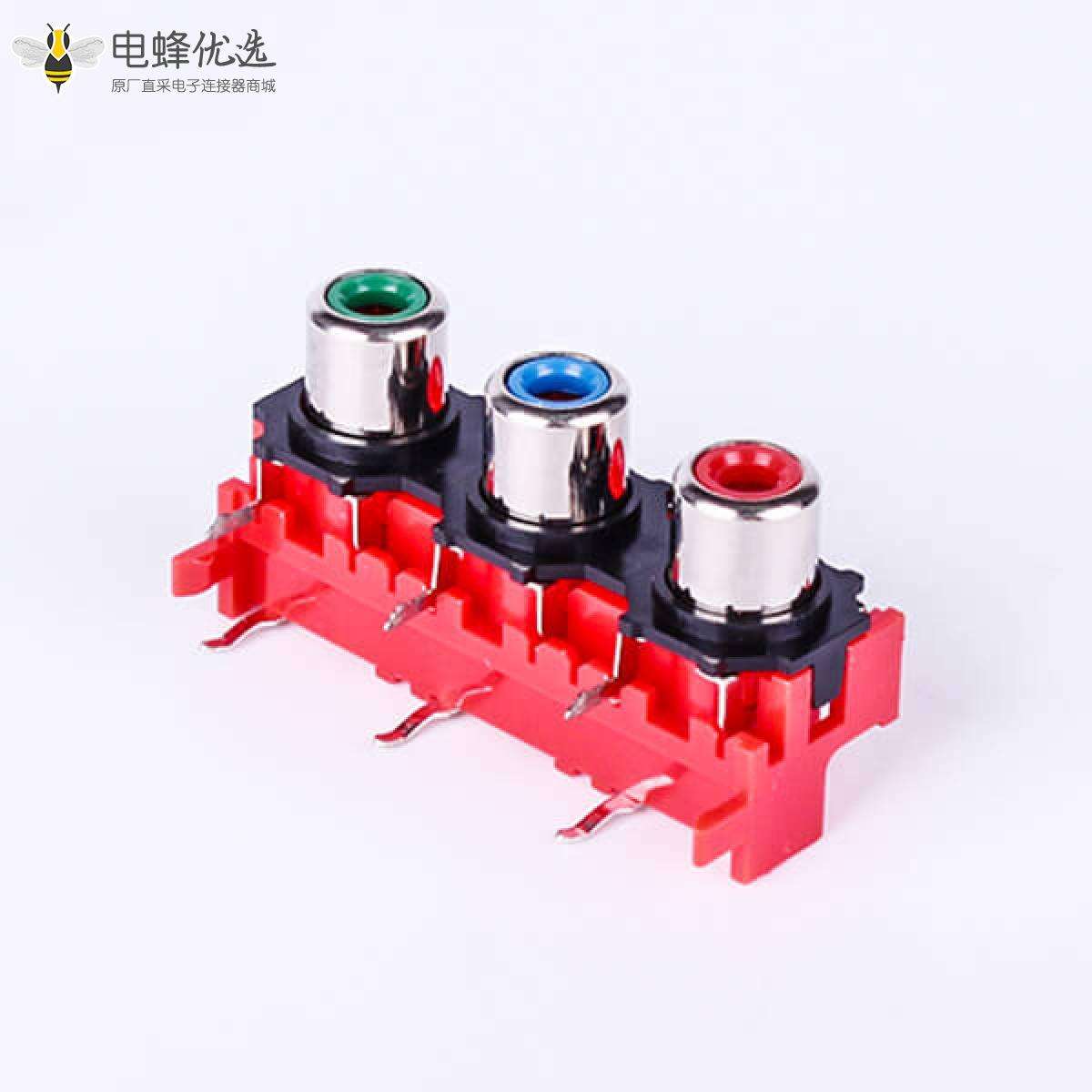 RCA连接器,母,插座,90°弯式,3孔,1*3,接板,焊板,红色塑胶ABS.PBT,镀镍;