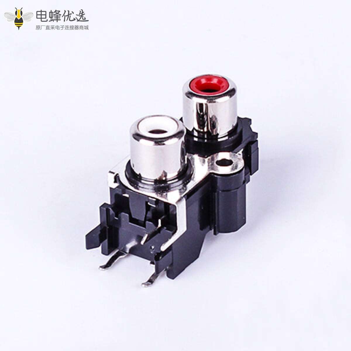 RCA连接器,母,插座,90°弯式,2孔,2*1,带螺丝孔,接板,焊板,黑色塑胶,ABS.PBT,镀镍;