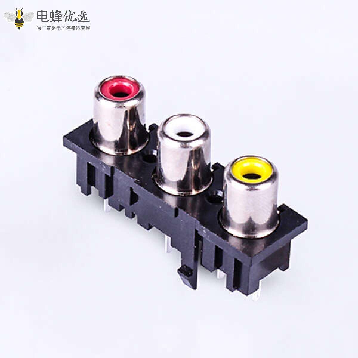 RCA连接器,母,插座,180°直式,单排3孔,接板,插板,黑色塑胶,ABS.PBT,镀镍;