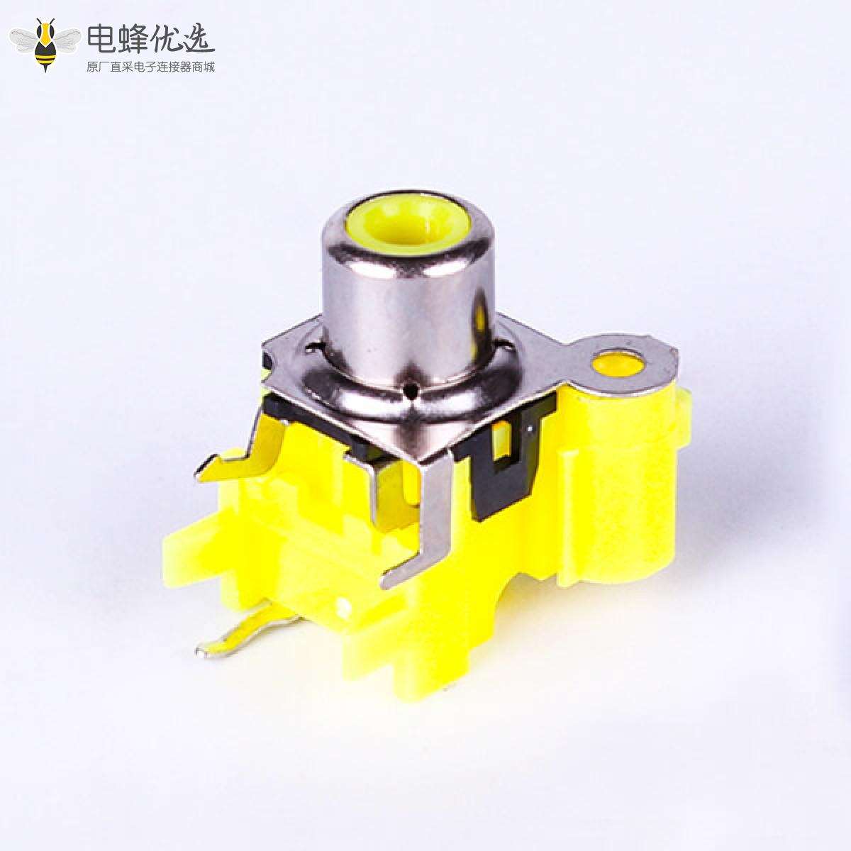 RCA连接器,母,插座,90°弯式,单口,带螺丝孔,接板,焊板,黄色塑胶ABS.PBT,镀镍;