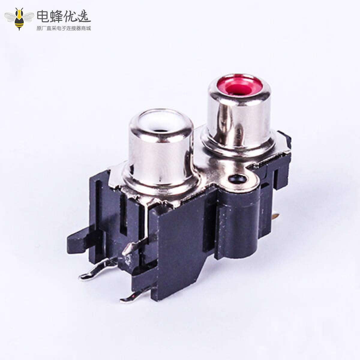 RCA连接器,母,插座,90°弯式,2孔,2*1,带螺丝孔,接板,焊板,黑色塑胶ABS.PBT,镀镍;