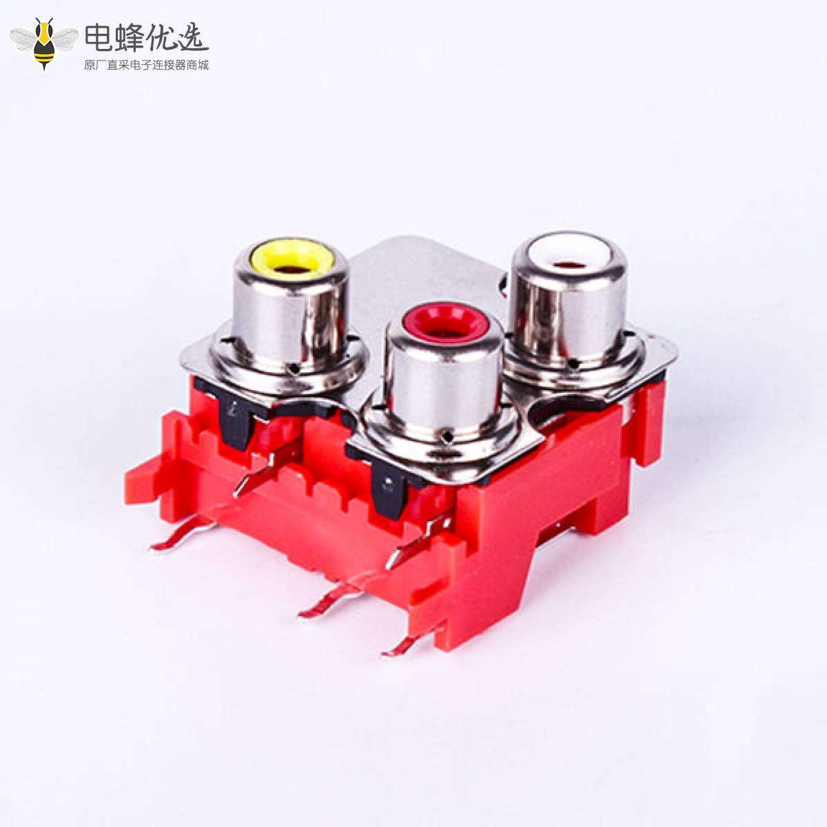 RCA连接器,母,插座,90°弯式,3孔,接板,插板,红色塑胶,ABS.PBT,镀镍;