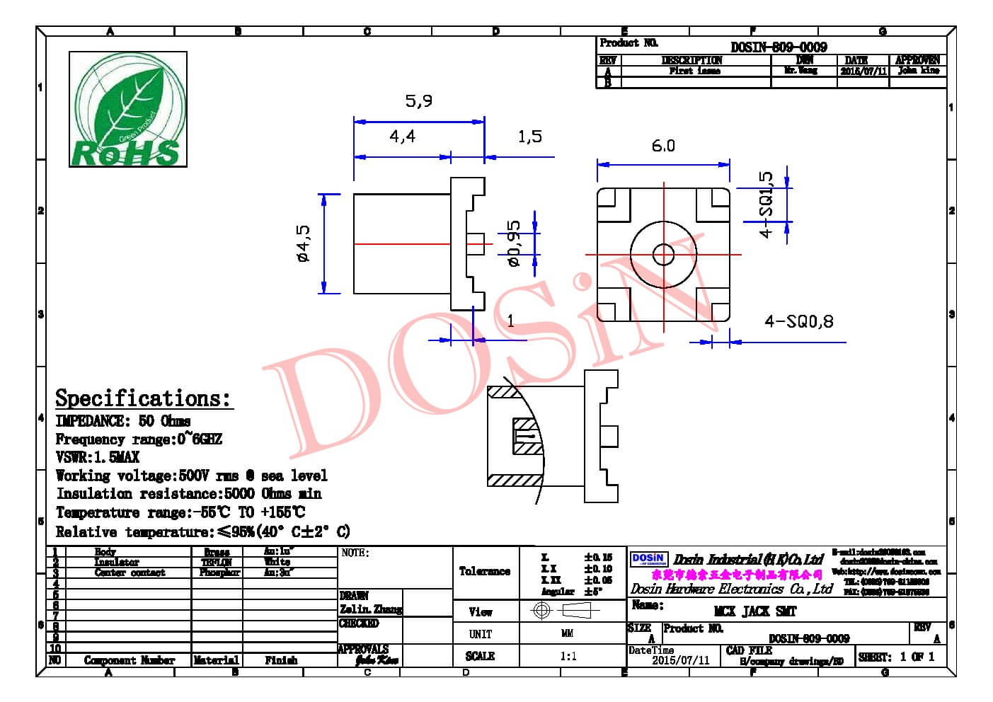 - 中心接触电阻: ≦ 5.0 mΩ (Milliohms max.)