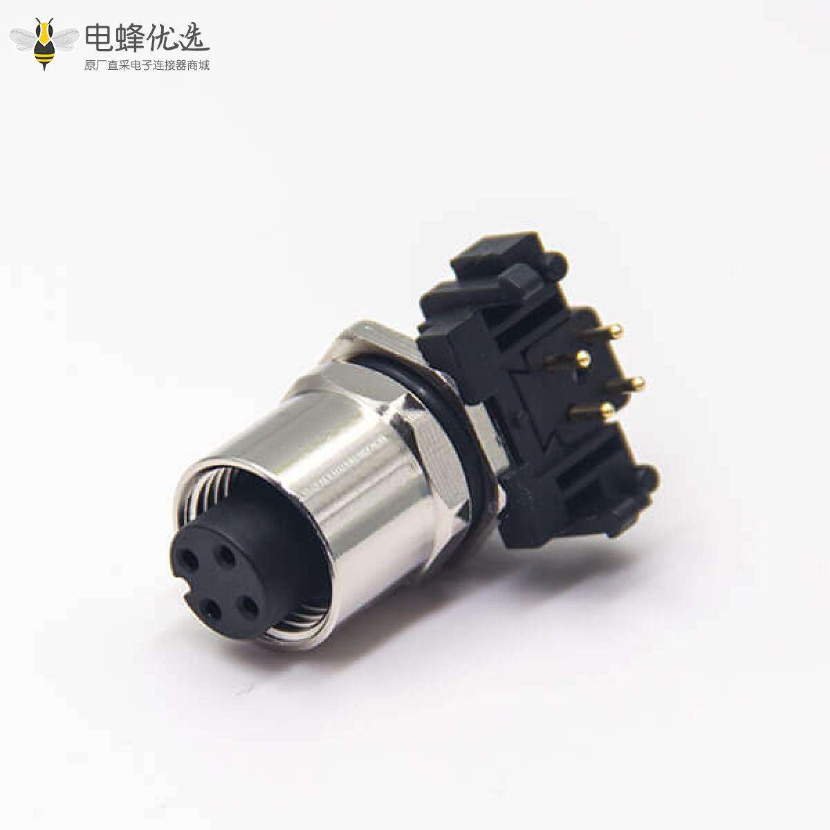 M12,板端插座,A编码,4芯,弯式,母头,穿墙,插PCB板安装;