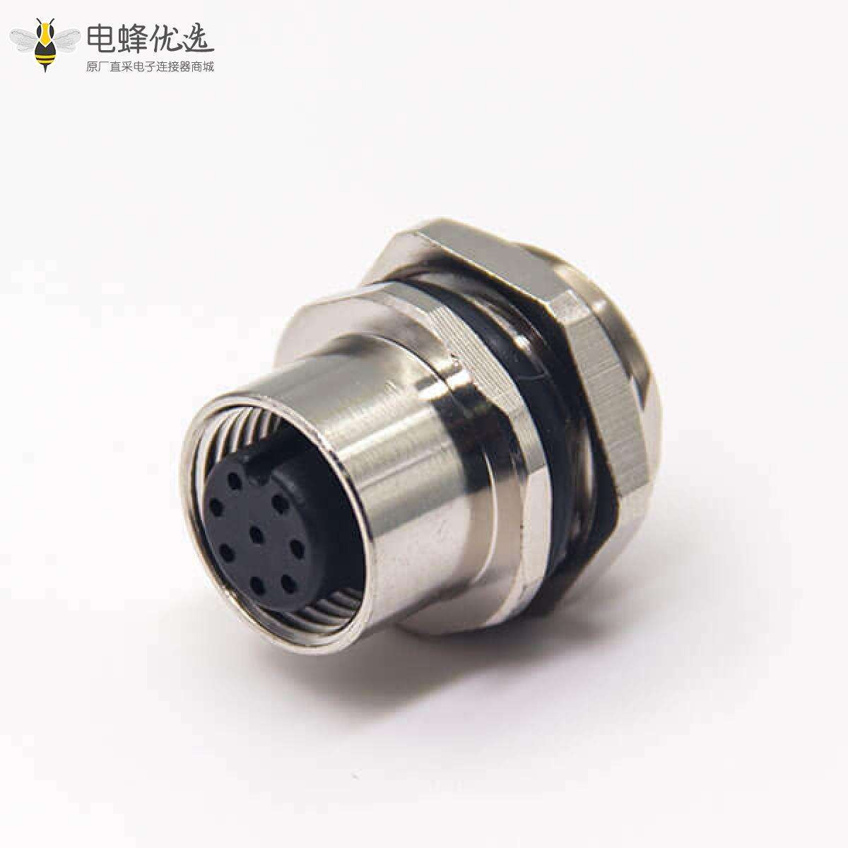 M12板端插座,A编码,8芯,直式,母头,焊线,后锁板,面板安装;