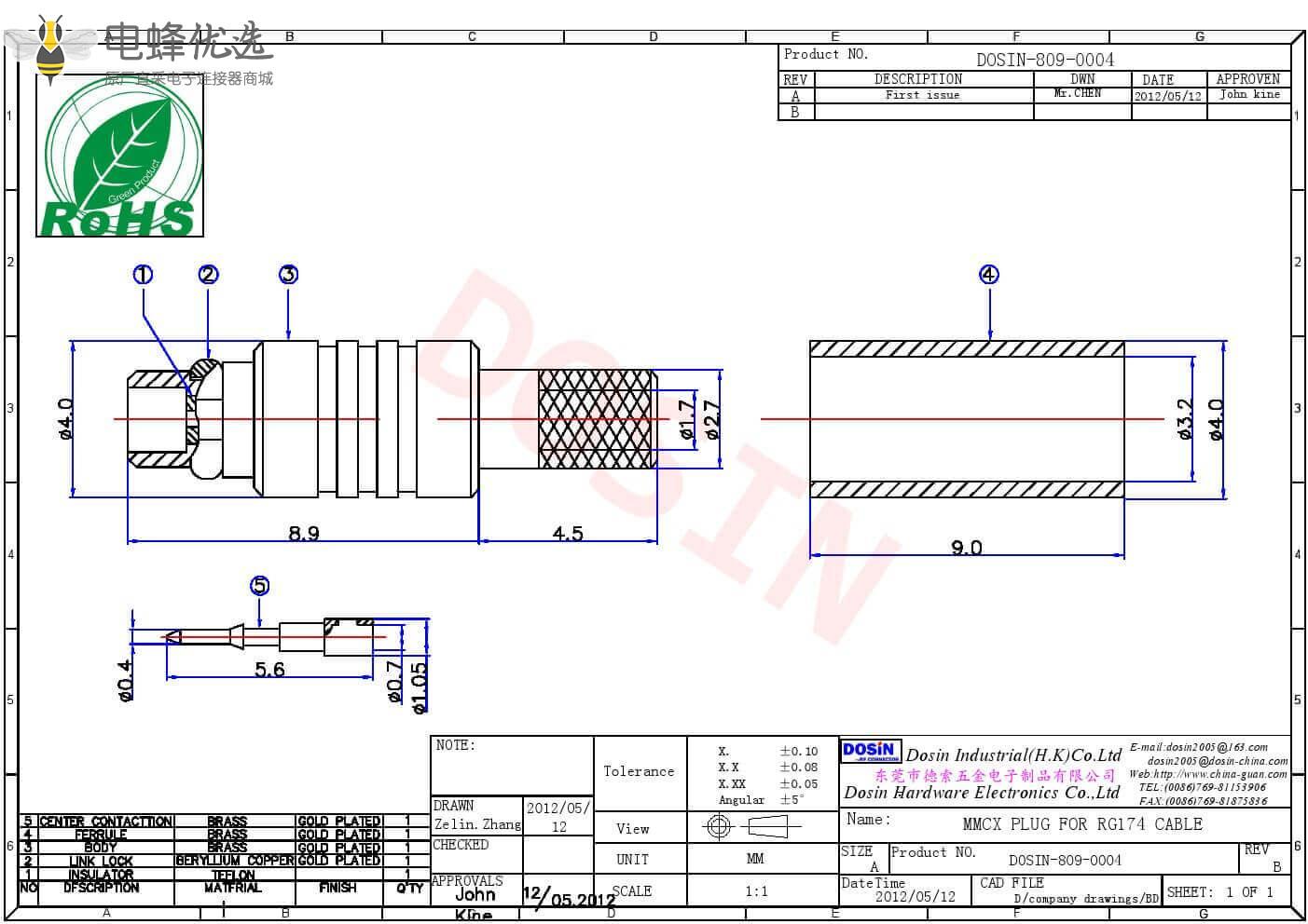 - mmcx连接器,同轴线缆,公头,50欧,直式,压接;