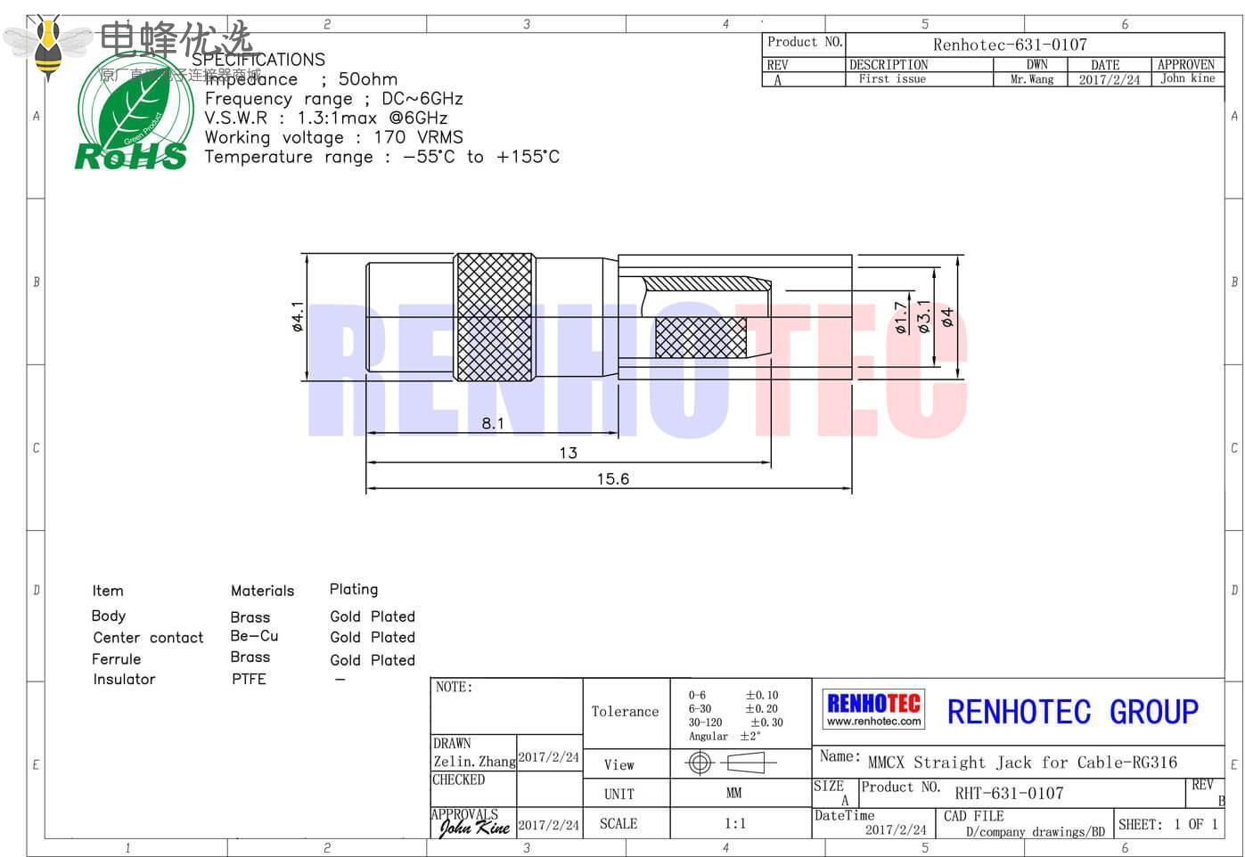 - mmcx连接器,同轴线缆,母头,50欧,直式,压接,RG316;