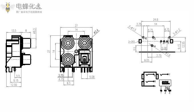 RCA连接器,母,插座,90°弯式,3孔,接板,插板,带光纤端子,黑色塑胶,ABS.PBT,镀镍;