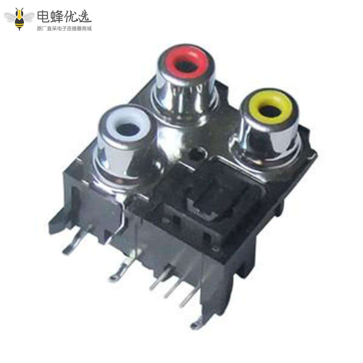 RCA连接器,母,插座,90°弯式,3孔,接板,插板,带光纤端子,黑色塑胶,ABS.PBT,镀镍;