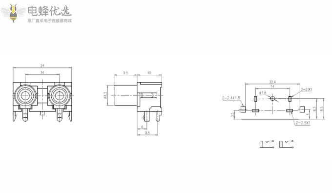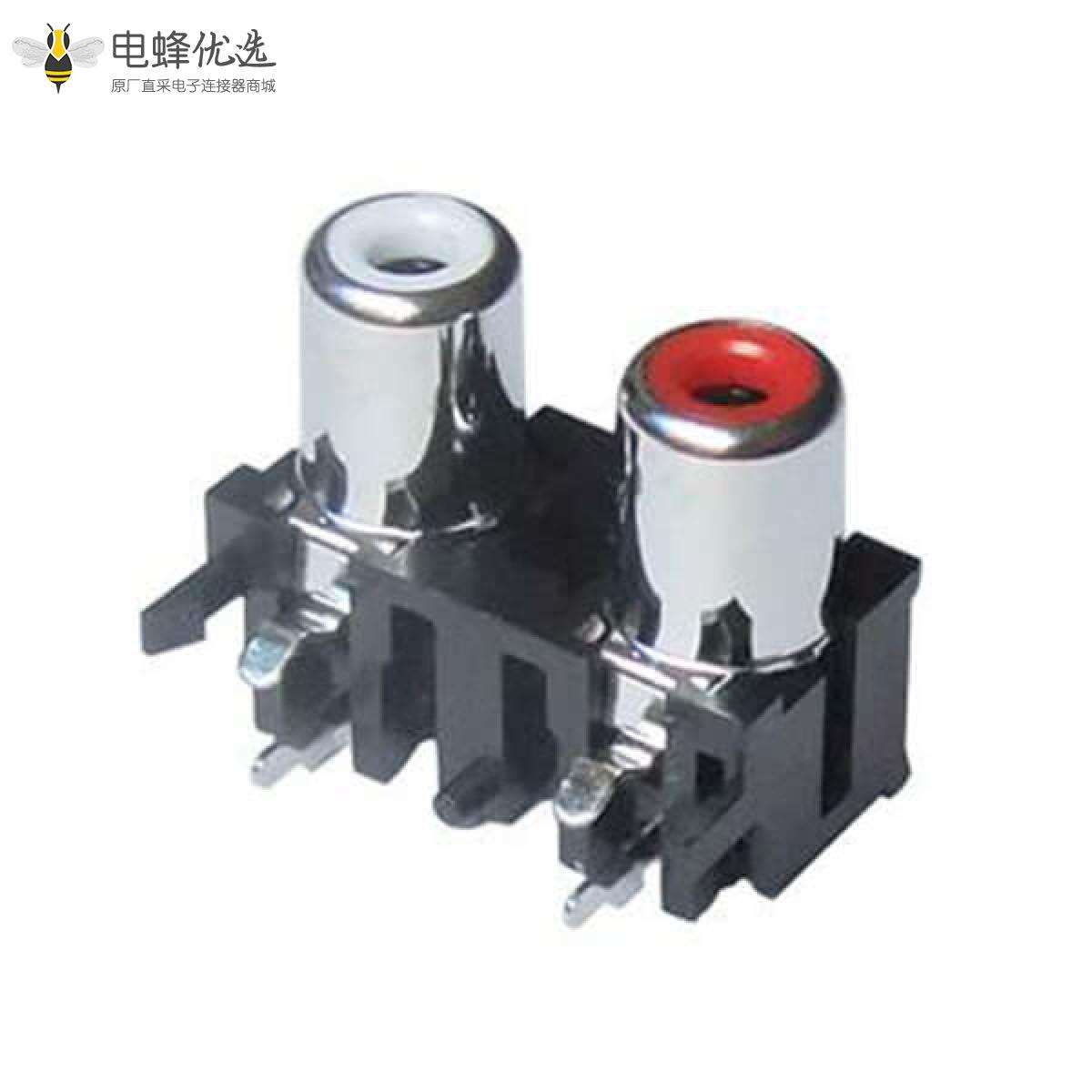 RCA连接器,母,插座,90°弯式,2孔,1*2,接板,插板,带金属屏蔽,黑色塑胶,ABS.PBT,镀镍;