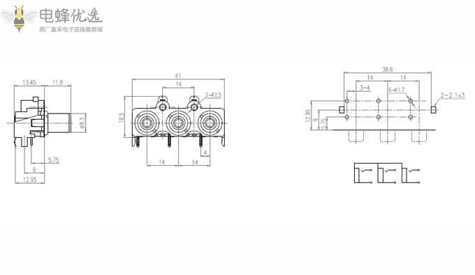 RCA连接器,母,插座,90°弯式,3孔,1*3,接板,插板,带金属屏蔽,黄色塑胶,ABS.PBT,镀镍;