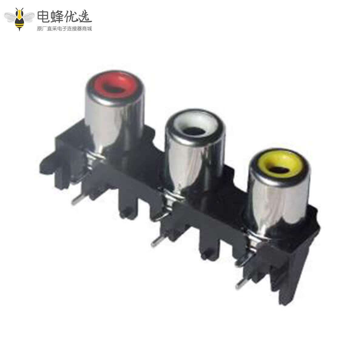 RCA连接器,母,插座,90°弯式,3孔,1*3,接板,插板,黑色塑胶,ABS.PBT,镀镍;