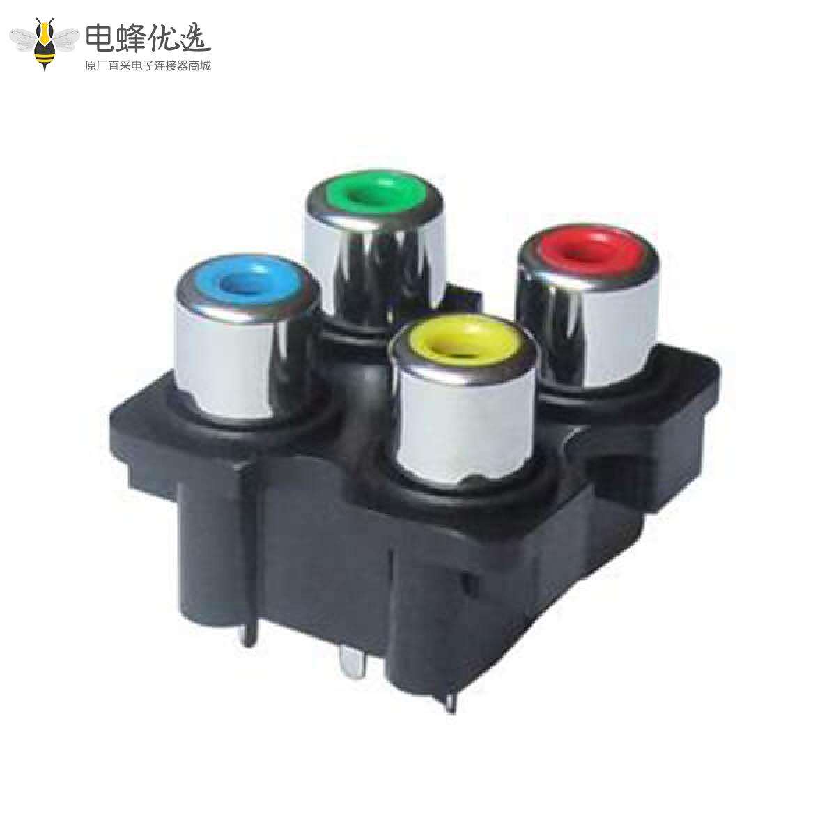 RCA连接器,母,插座,90°弯式,4孔,2*2,接板,插板,黑色塑胶,ABS.PBT,镀镍;