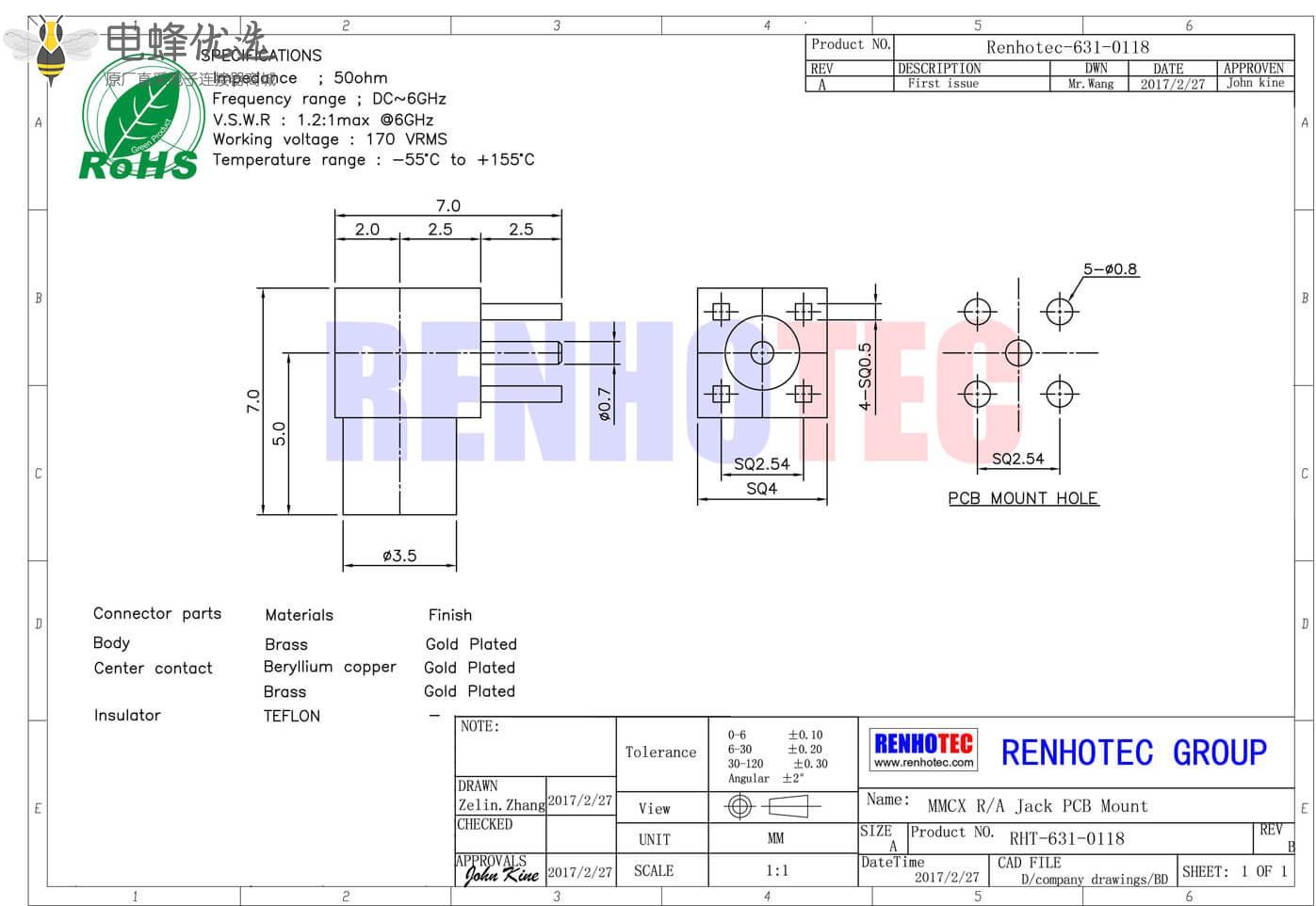 - mmcx连接器,pcb板,母头,50欧,弯插;