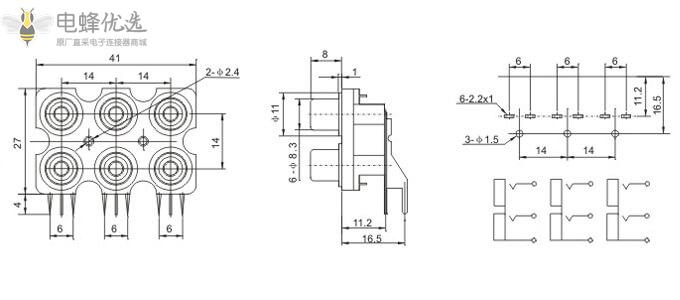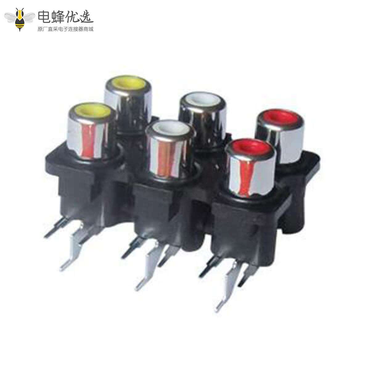 RCA连接器,母,插座,90°弯式,6孔,2*3,接板,插板,不带屏蔽,黑色塑胶,ABS.PBT,镀镍;