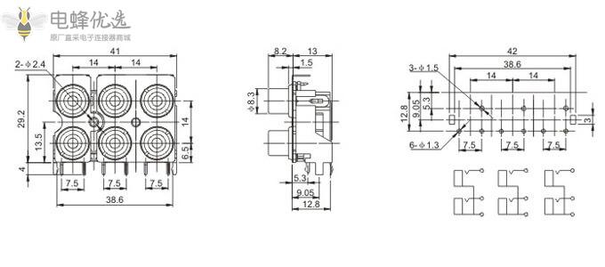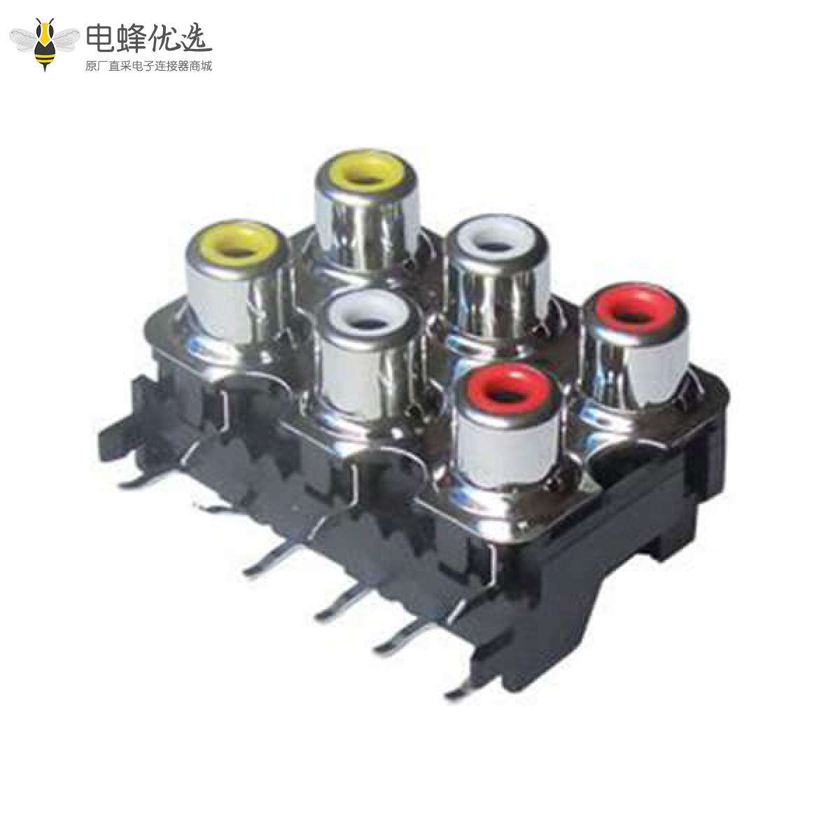 RCA连接器,母,插座,90°弯式,6孔,2*3,接板,插板,带金属屏蔽,黑色塑胶,ABS.PBT,镀镍;