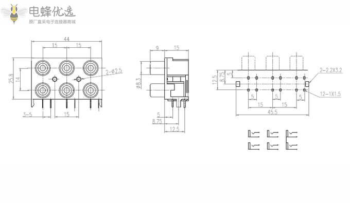 6孔位弯式RCA接口2*3 90度