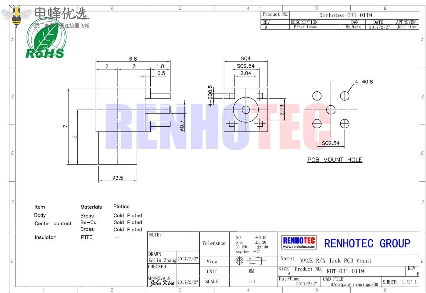 - mmcx连接器,pcb板,母头,50欧,弯插;