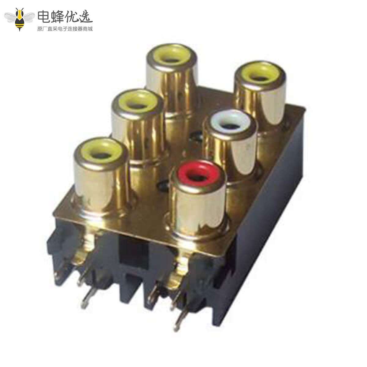 RCA连接器,母,插座,90°弯式,6孔,3*2,接板,插板,带金属屏蔽,黑色塑胶,ABS.PBT,镀金;