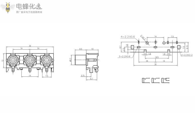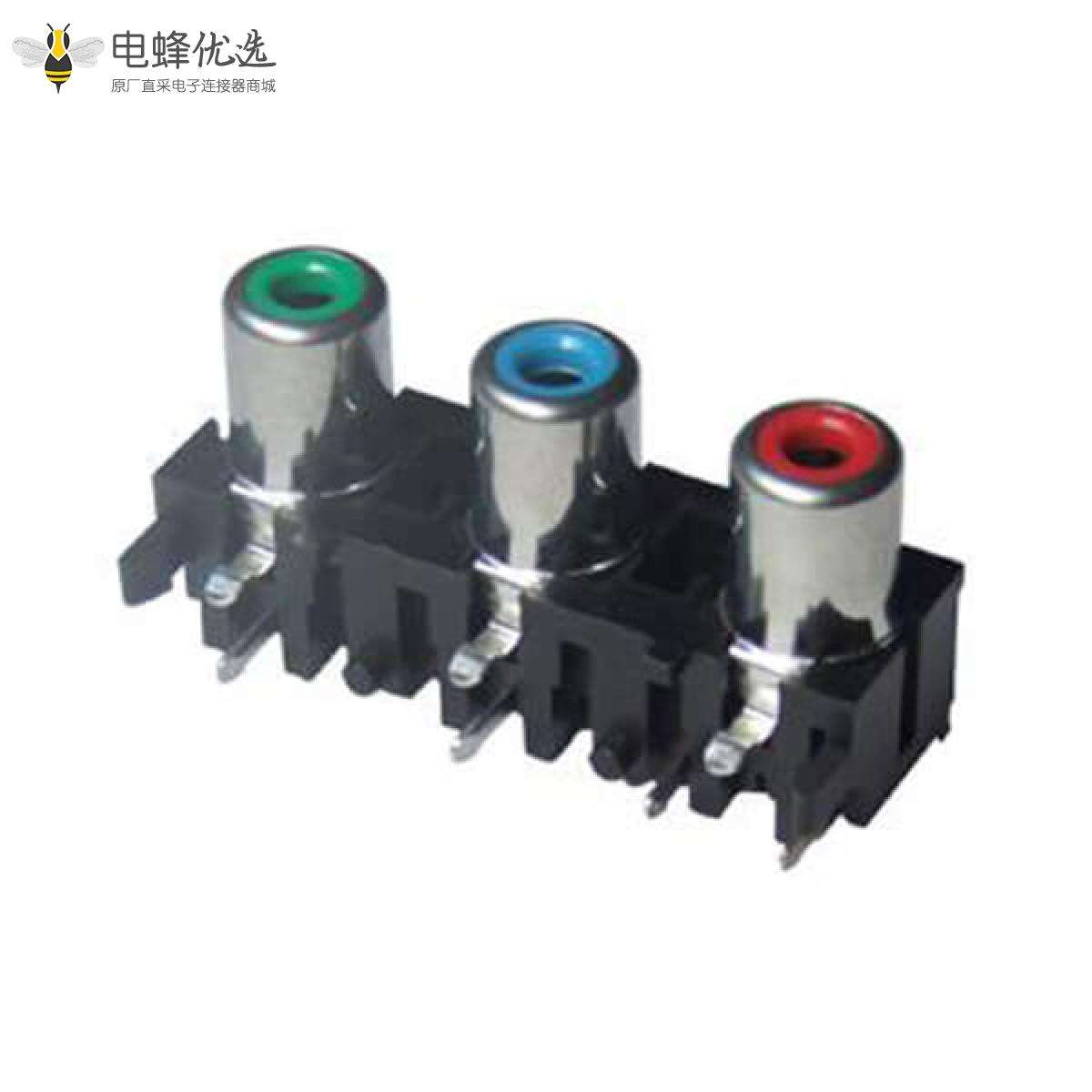 RCA连接器,母,插座,90°弯式,3孔,1*3,接板,插板,不带屏蔽,黑色塑胶,ABS.PBT,镀镍;