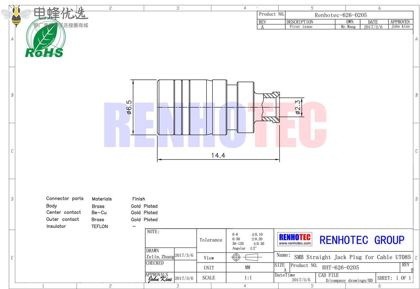 - 焊接,公头,直式,RF射频同轴,SMB连接器,50欧姆,同轴线缆,UT085;