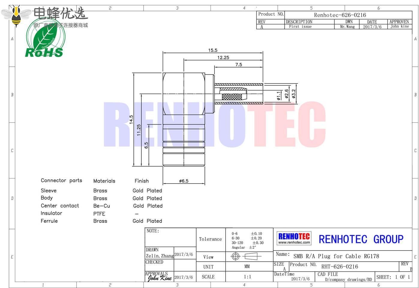 - 公头,弯式,RF射频同轴,SMB连接器,50欧姆,同轴线缆,压接,RG178;