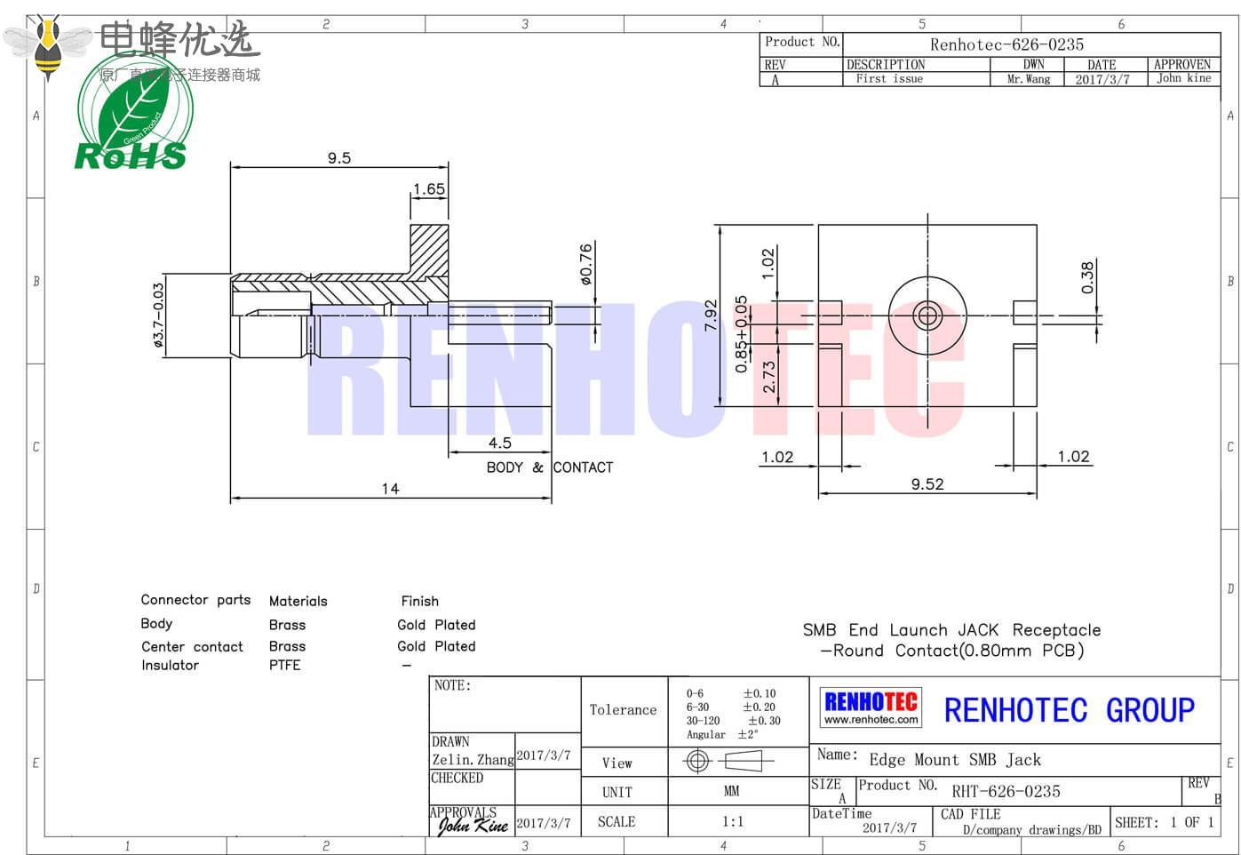 - PCB板端,母头,边缘卡板,RF射频同轴,SMB连接器,50欧姆;