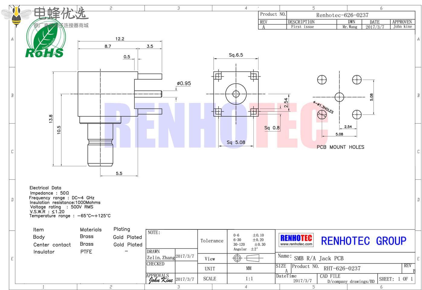 - PCB板端,母头,弯插,RF射频同轴,SMB连接器,50欧姆;