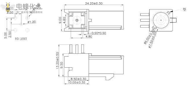 - RF连接器,接PCB板,FAKRA公头,90度;