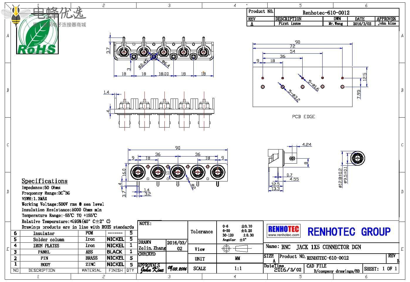 - PCB板端,母头,弯式,黑色塑胶外壳,RF射频同轴,BNC连接器,50欧姆;