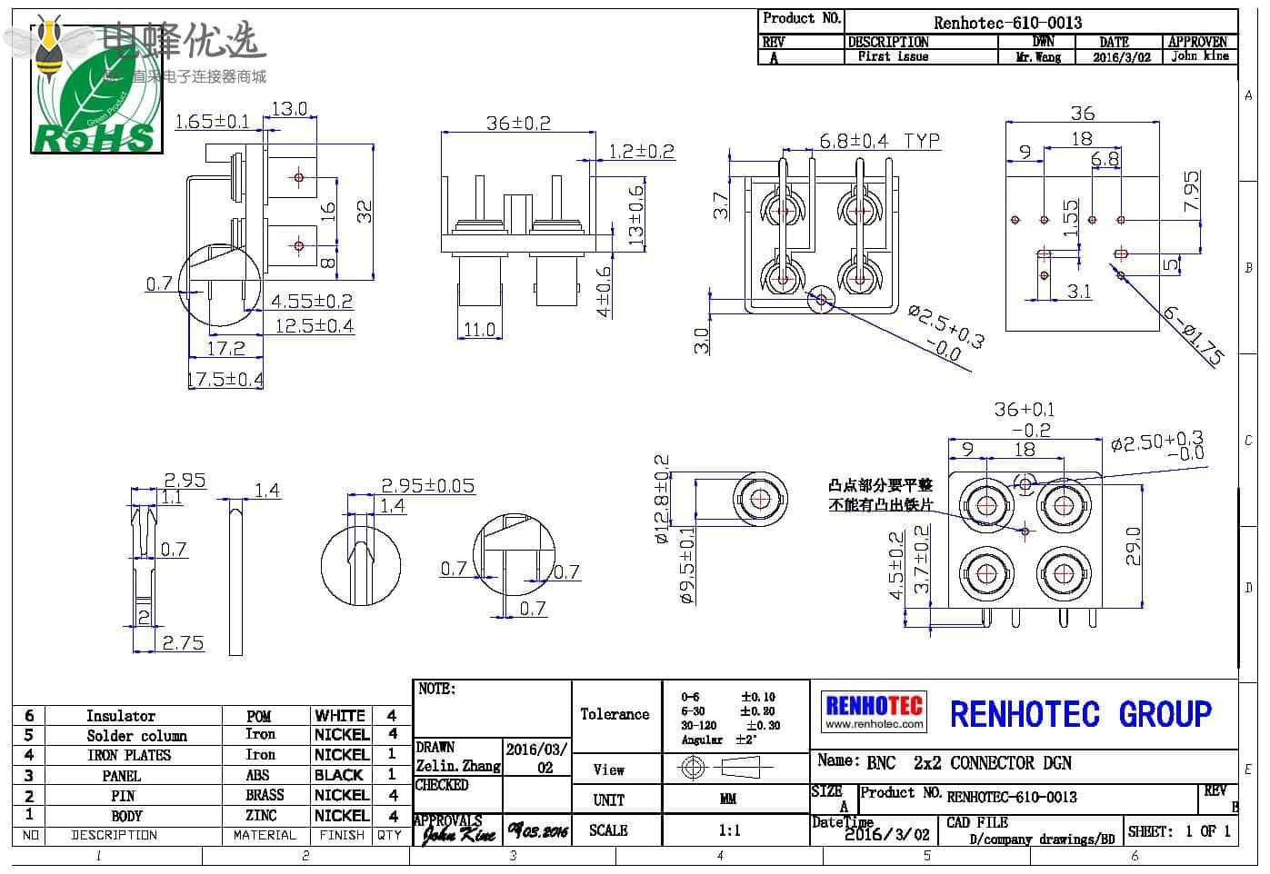 - PCB板端,母头,弯式,锌合金,RF射频同轴,BNC连接器,50欧姆;