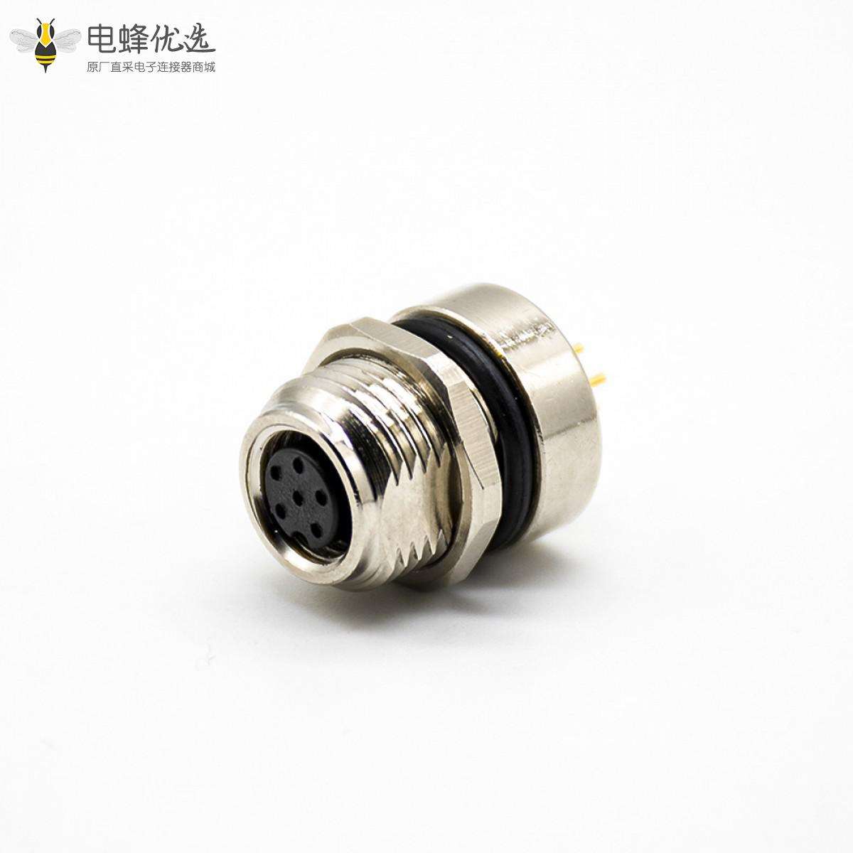 - M8板端插座,A扣,180°,6芯,母头,接PCB板,焊接式,前锁板,防水;
