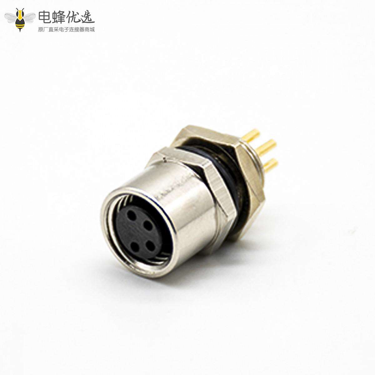 - M8板端插座,180°,4芯,母头,接PCB板,焊接式,后锁板,防水;