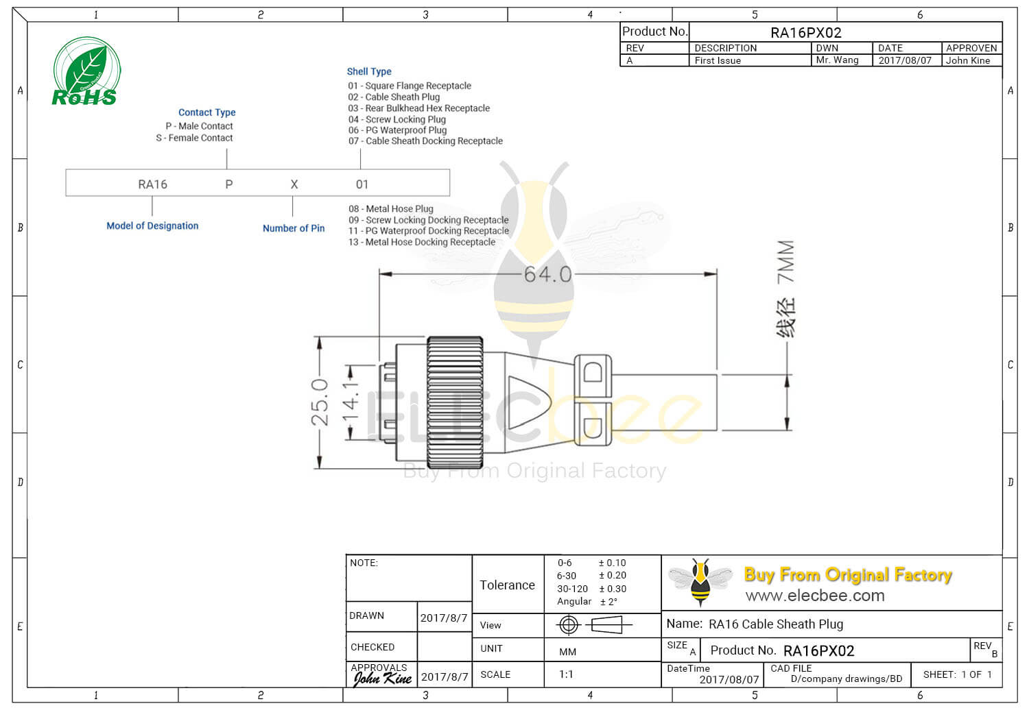 - 3芯, RA16 连接器, 电缆护套插头, 直式, 公头, 防水, 航空工业;