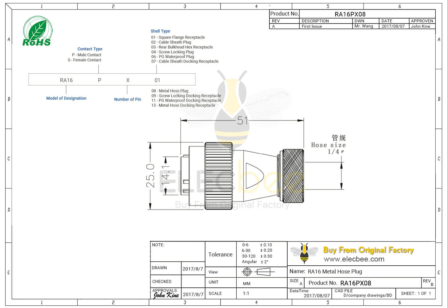- 3芯, RA16 连接器, 金属软管插头, 直式, 公头, 防水, 航空工业;