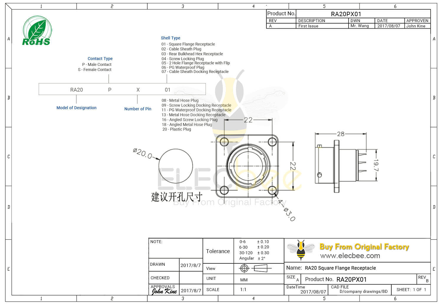 - 3芯, RA20 连接器, 4孔方形法兰, 直式, 座件, 母头, 防水, 航空工业;