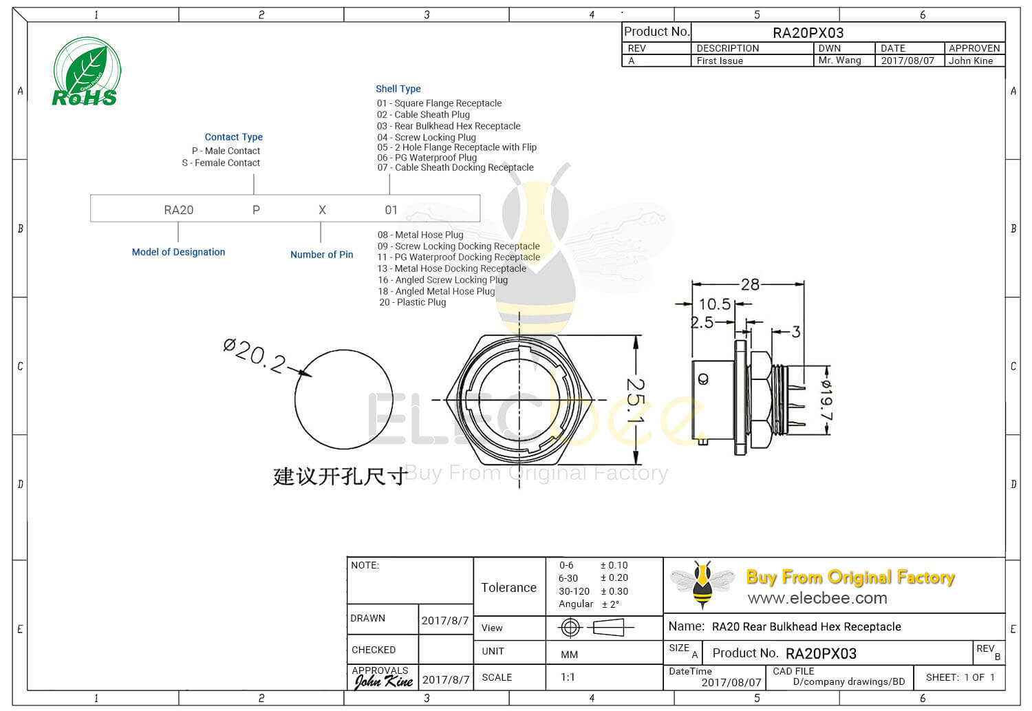 - 5芯, RA20 连接器, 后锁安装, 直式, 座件, 母头, 防水, 航空工业;