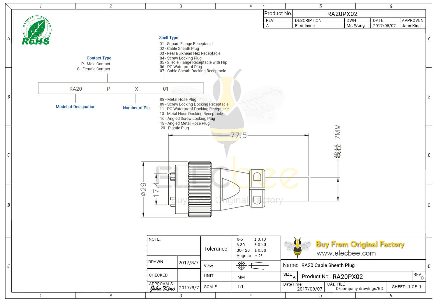 - 3芯, RA20 连接器, 电缆护套插头, 直式, 公头, 防水, 航空工业;