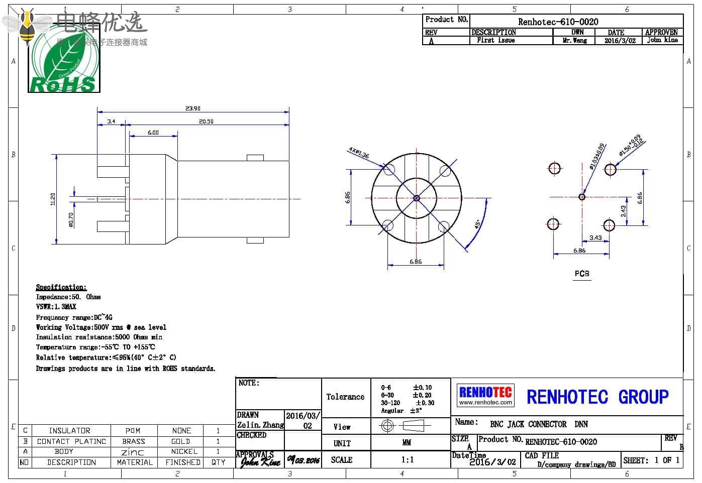- PCB板端,母头,直式,锌合金,RF射频同轴,BNC连接器,50欧姆;