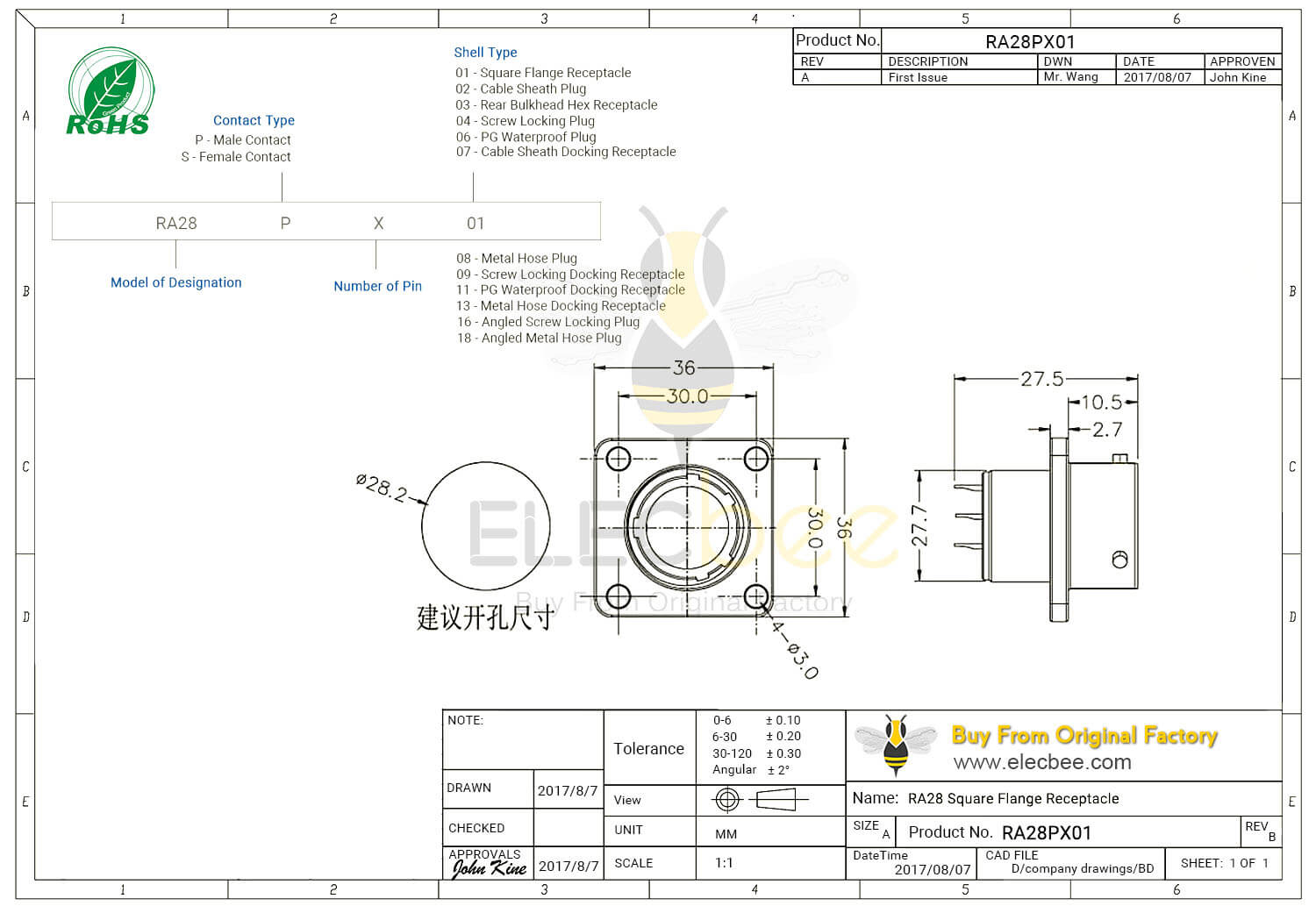 - 16芯, RA28, 4孔方形法兰, 直式, 座件, 母头, 防水, 圆形工业防水航空连接器;