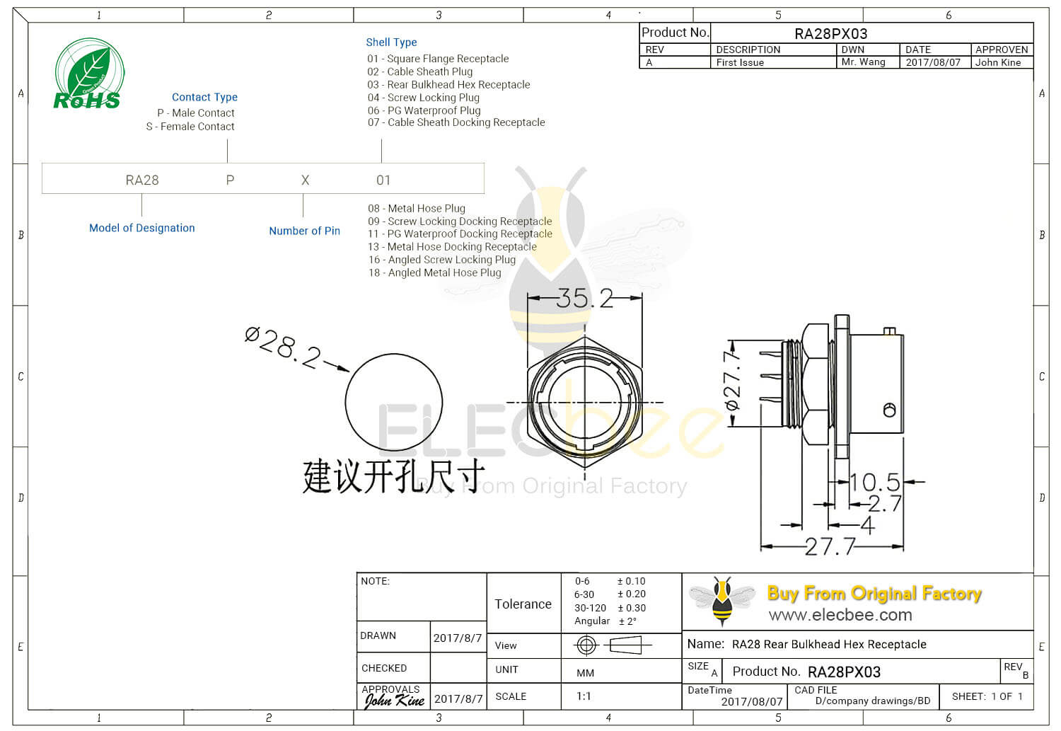 - 16芯, RA20 连接器, 后锁安装, 直式, 座件, 母头, 圆形工业防水航空连接器;
