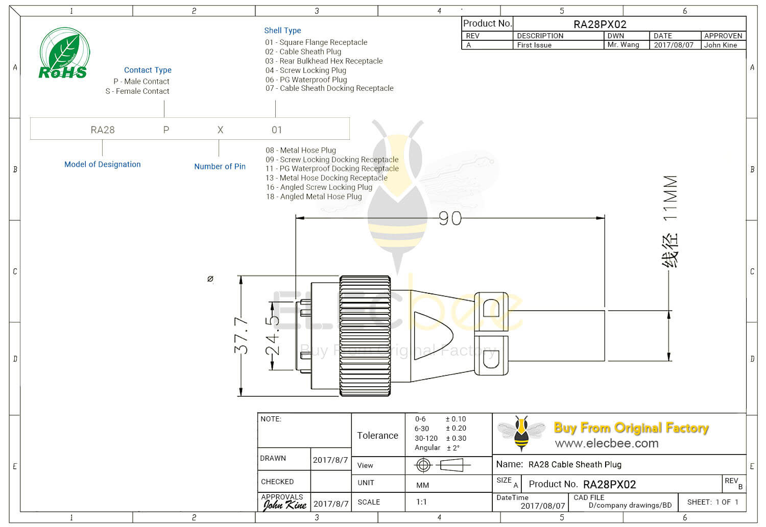 - 18芯, RA28, 电缆护套, 直式, 插头, 公头, 圆形工业防水航空连接器;