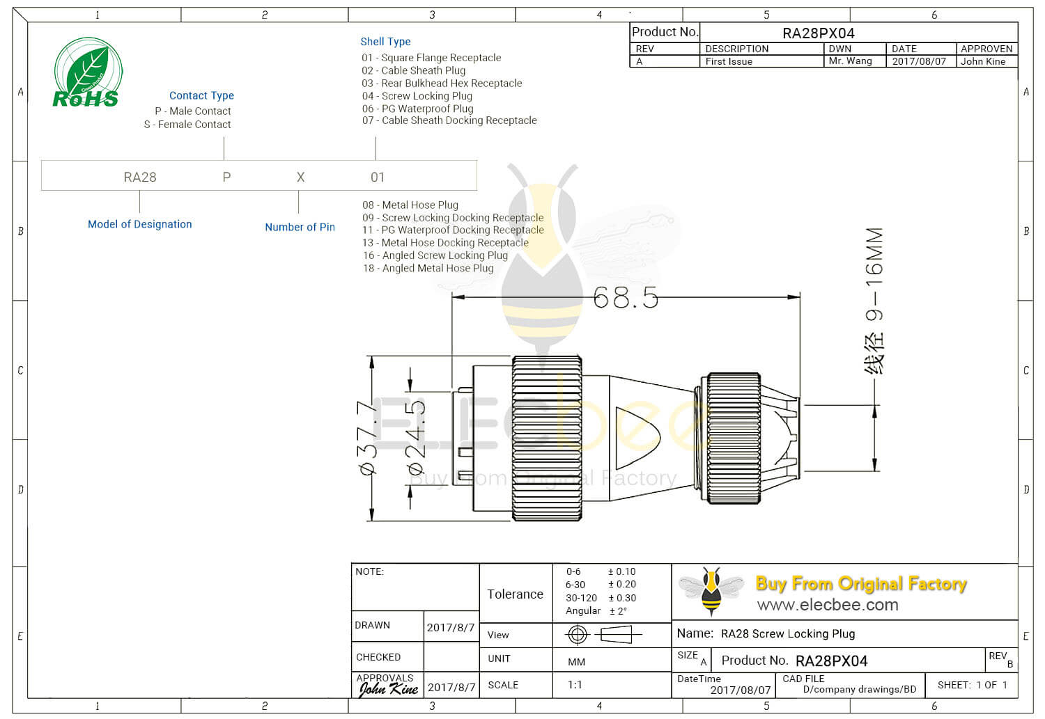 - 3芯, RA28, 螺帽锁紧, 直式, 插头, 公头, 圆形工业防水航空连接器;