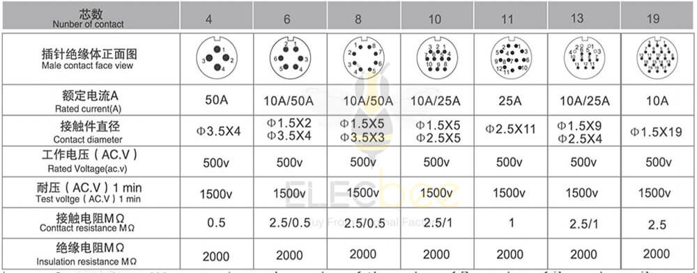 焊接芯件芯数排列及技术特性表