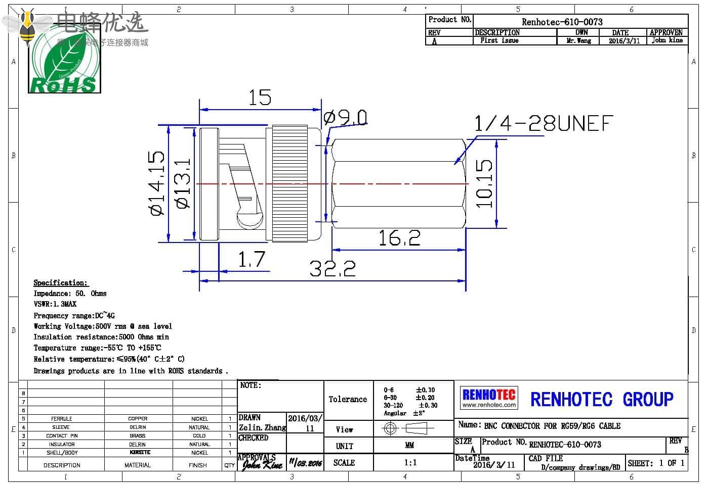 - 中心接触电阻:≦ 1.5 mΩ (Milliohms max.)