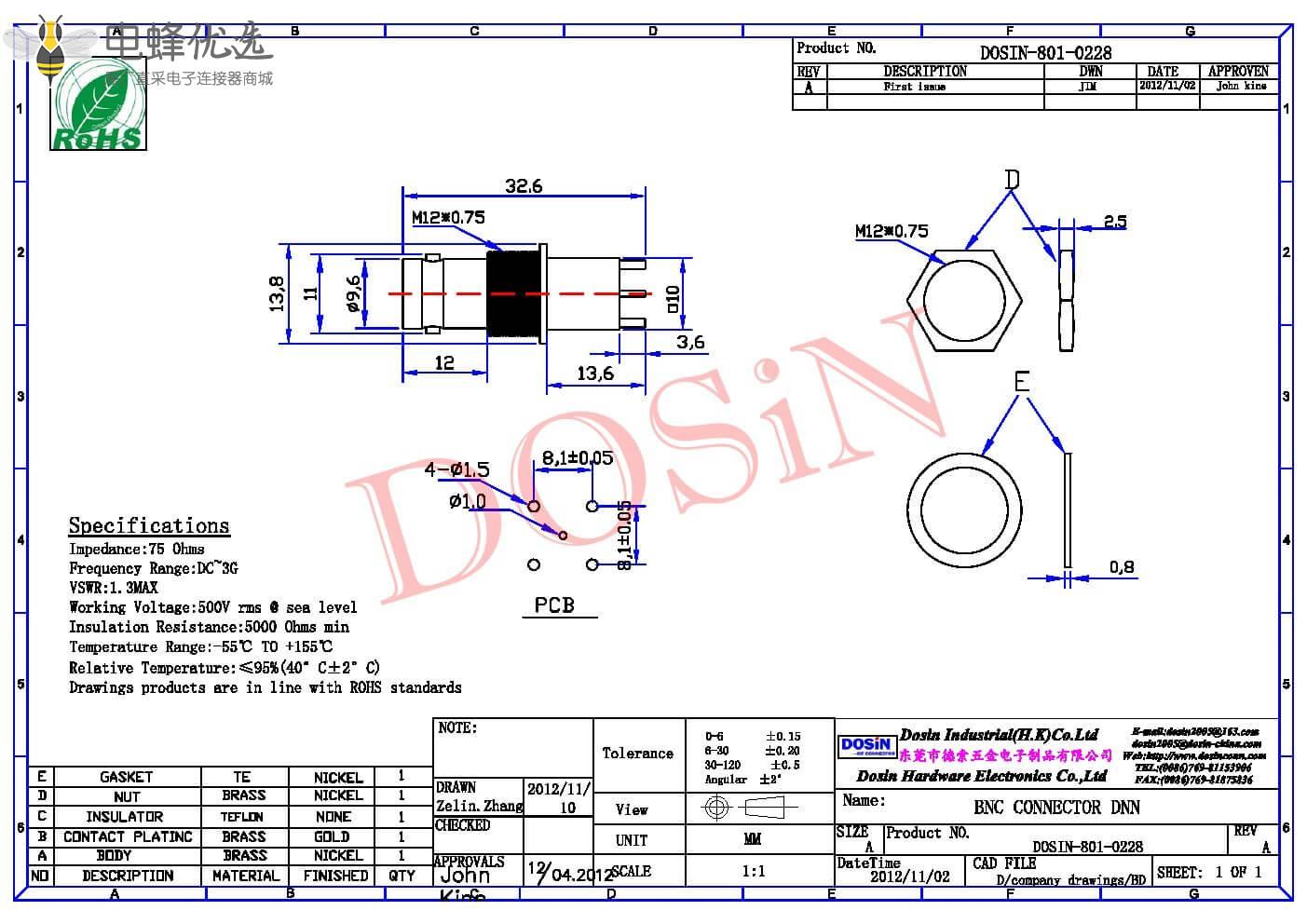 - PCB板,直式,母头,75欧姆,镀镍,RF射频同轴,BNC连接器,穿墙;