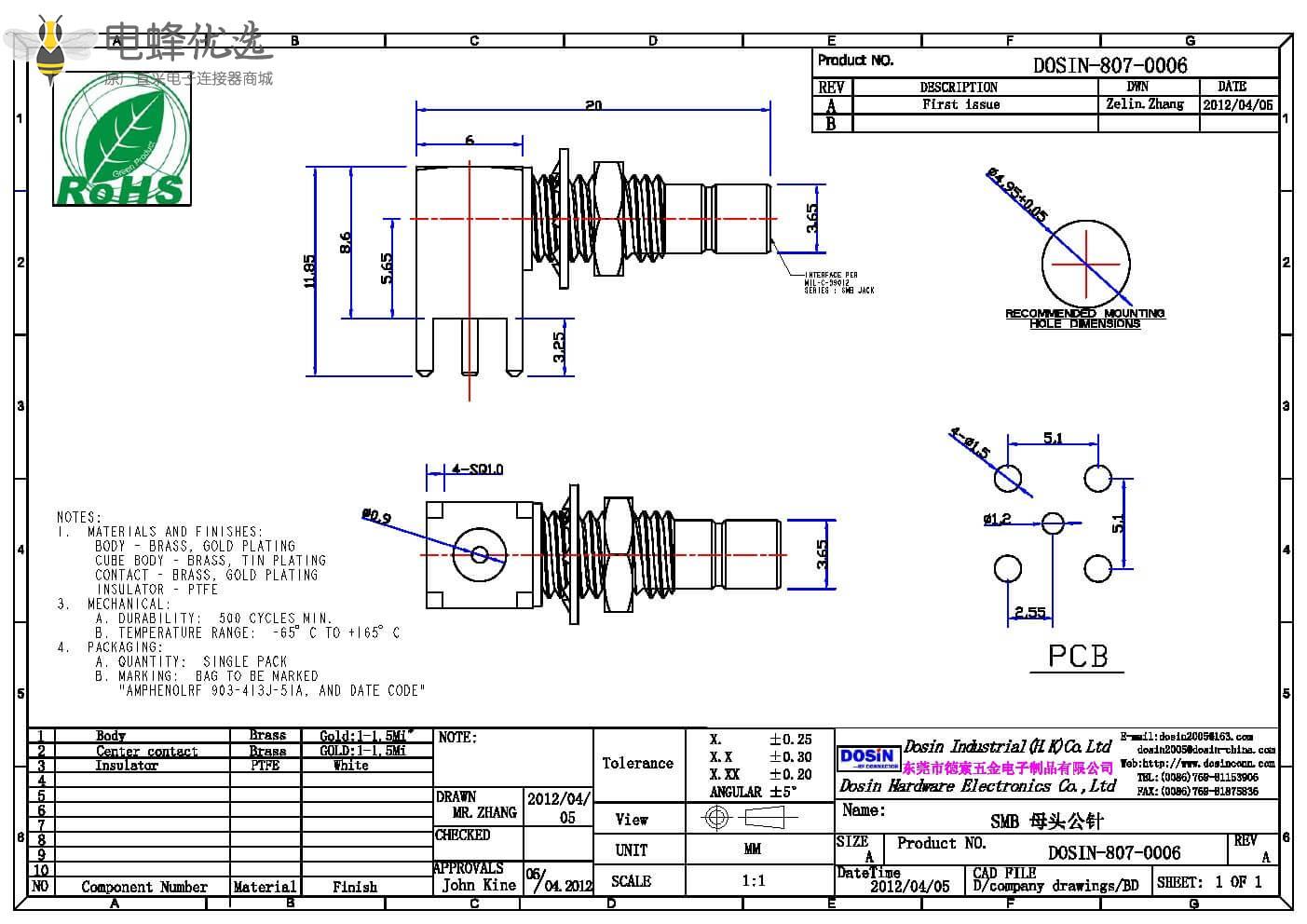 - PCB板端,母头公针,弯插,RF射频同轴,SMB连接器,;